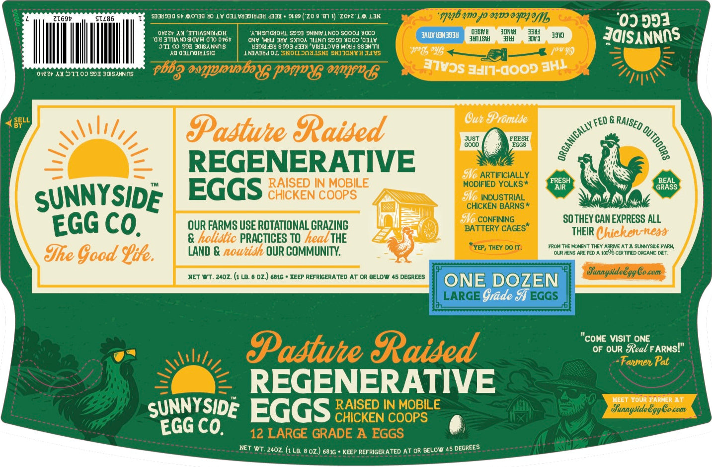 The vast majority of "pasture raised" and "free range" eggs come from hens that have never been outdoors a single day in their lives. Don't be fooled by cute cartons. Factory farming is still alive and well, but we're here to change it. At Sunnyside, we use small flocks and mobile chicken houses that are rotated around pastures to ensure our hens spend their lives outdoors fully expressing their natural "chicken-ness"!
